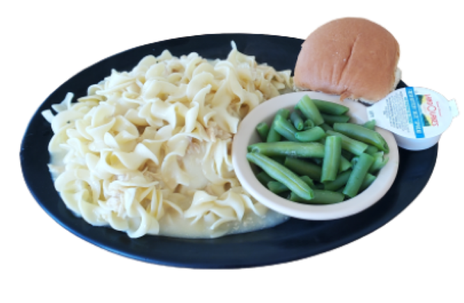 Chicken & Noodles served over mashed potatoes w/ green beans, dinner roll and a drink